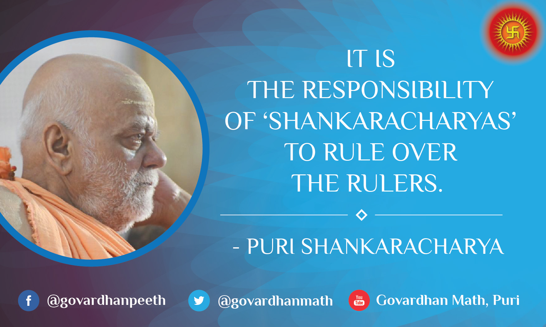 Bhagavatpada Adi Shankaracharya established the Govardhana Peetha at Jagannath Puri on the Kartika Shukla Panchami of Yudhishtira Saka Samvat 2651 or 486 BC. The Puri Peeth is related to Rig Veda. Its main preaching theme or Mahavakya is प्रज्ञानं ब्रम्ह.
